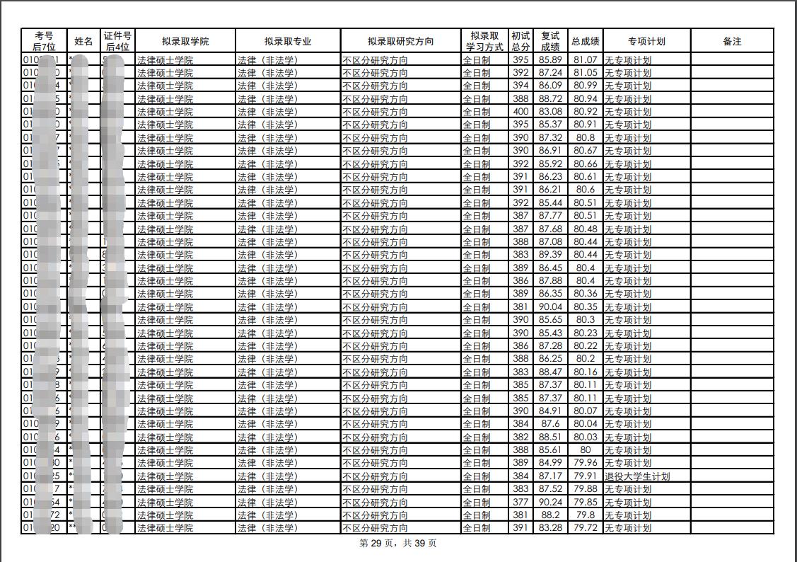 法律(法學)民商經濟法學院錄取29人,其中包括4少骨,1退役士兵,最高分407,最低分368,平均分388