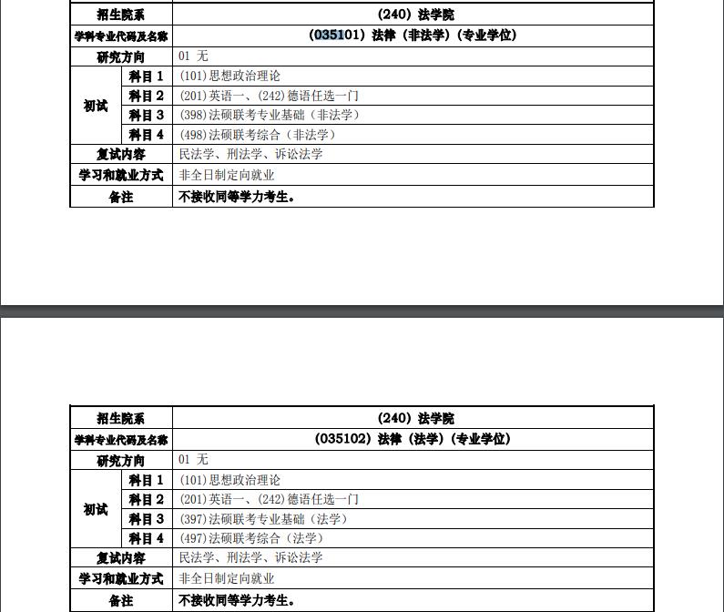 2.報考法律(法學)(專業代碼:035102)的考生,報考前所學專業為法學專業(僅普通高等學校本科專業目錄法學門類中的法學類專業[代碼為0301]畢業生、專科層次法學類畢業生和自學考試形式的法學類畢業生等方可報考)。