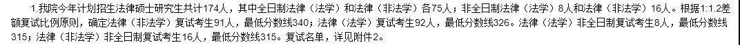 法碩(非法學(xué)):一志愿共進(jìn)入復(fù)試 107 人(含 16 非全),全日制最高分403,最低 340。