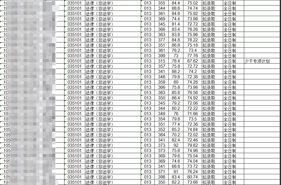 法碩(法學(xué)):一志愿共進(jìn)入復(fù)試 100 人(含 8 非全),全日制最高分384,最低 326。