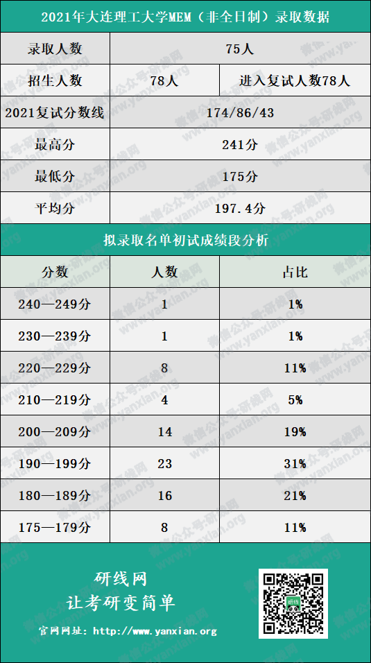 復試分數線為174/86/43,錄取最高分為241分,最低分175為分,平均分為197.4分。