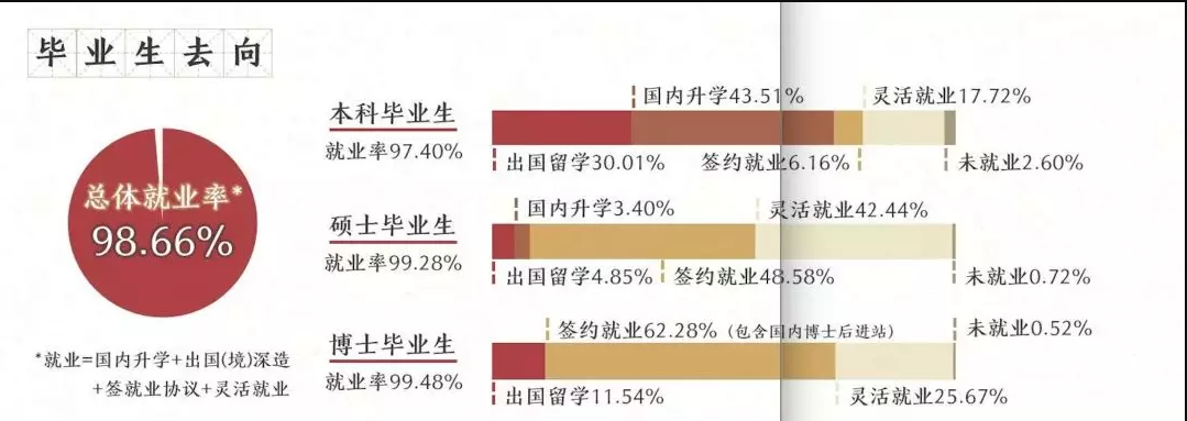 2019年碩士畢業(yè)生占比47.77%,男女比為1.11:1。畢業(yè)生總體就業(yè)率為98.66%,其中碩士畢業(yè)生就業(yè)率為99.28%,靈活就業(yè)占比42.44%。
