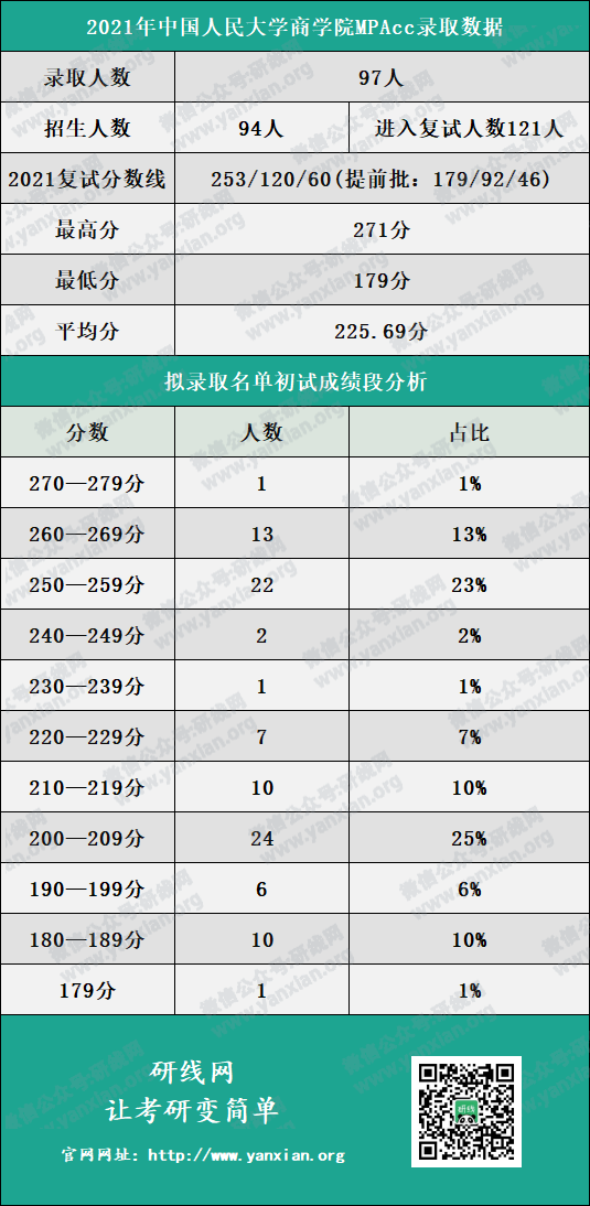 中國人民大學商學院2021年會計專碩計劃招生人數為94人,進入復試人數為121人,擬錄取人數為97人。