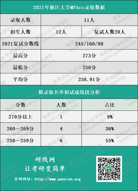 浙江大學管理學院2021年MPAcc計劃招生人數為12人,復試人數為20人,擬錄取人數為11人。