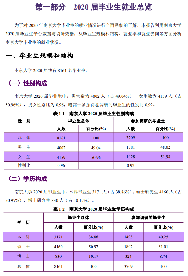 南京大學(xué)公布的《南京大學(xué)2020畢業(yè)生就業(yè)質(zhì)量年度報(bào)告》,涵蓋了2020屆畢業(yè)生的畢業(yè)規(guī)模和結(jié)構(gòu)、就業(yè)和升學(xué)狀況、就業(yè)去向、畢業(yè)生就業(yè)質(zhì)量與就業(yè)能力分析等內(nèi)容,從多方面分析南京大學(xué)畢業(yè)生的就業(yè)情況。