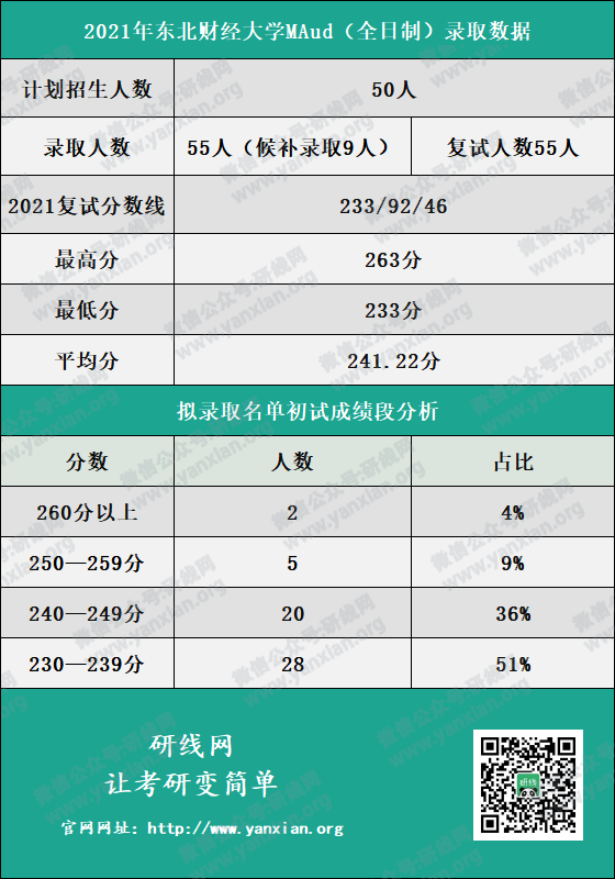 東北財經大學會計學院全日制會計碩士2021年招生計劃為50人,擬錄取人數為55人(候補錄取9人)。