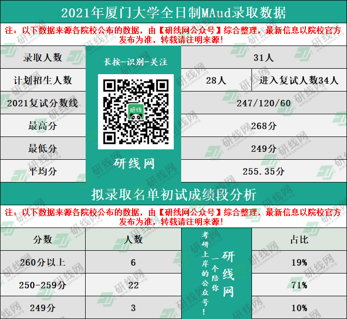 廈門大學管理學院全日制審計專碩2021年招生計劃為28人,復試人數為34人,擬錄取人數為31人。