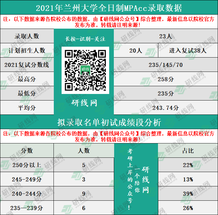 2021年蘭州大學全日制MPAcc計劃招生人數20人,進入復試38人,擬錄取碩士研究生23人。