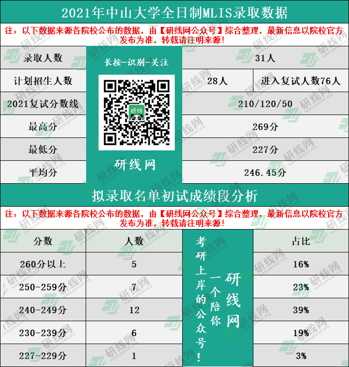 中山大學信息管理學院全日制圖書情報專業2021年招生計劃為28人,復試人數為76人,擬錄取人數為31人。