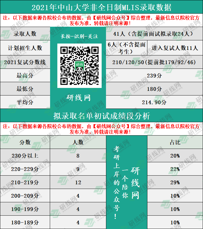 復試分數線為210/120/50,通過提前面試的考生適用國家A類分數線179/92/46,錄取最高分為239分,最低分為180分,平均分為214.90分。
