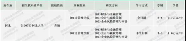 河北大學2020年全日制會計專碩學制學費:學制為2-4年,學費為0.7萬元/年;非全日制會計專碩學制學費:學制為3-5年,學費為1.6萬元/年