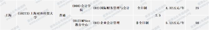 上海對(duì)外經(jīng)貿(mào)大學(xué)全日制會(huì)計(jì)專碩學(xué)制學(xué)費(fèi):學(xué)制為2.5年,2020年學(xué)費(fèi)為4.32萬元/年;非全日制會(huì)計(jì)專碩學(xué)制學(xué)費(fèi):學(xué)制為2.5年,2020年學(xué)費(fèi)為5.12萬元/年
