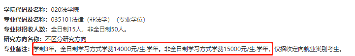 法碩(非法學)非全日制:學制為3年,學費15000元/生/年