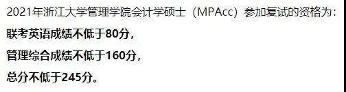 浙江大學2021年會計專碩復試分數線為:245/160/80