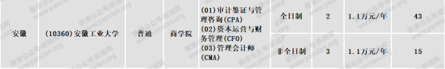 安徽工業大學2020年全日制會計專碩學制學費:學制為2年,學費為1.1萬元/年;非全日制學制學費:學制為3年,學費為1.1萬元/年