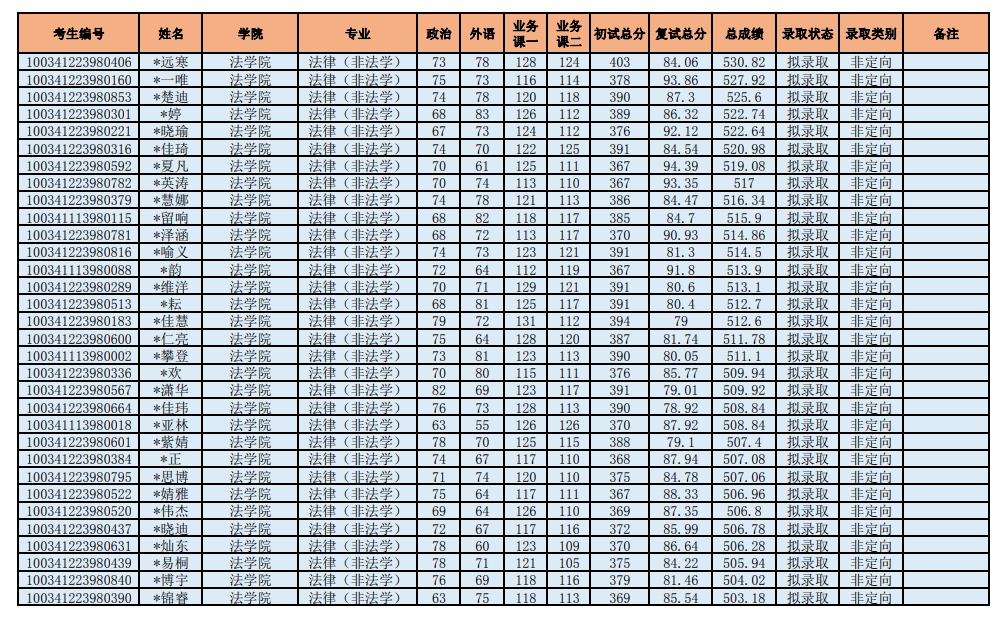 法碩(非法學(xué)):一志愿進(jìn)入復(fù)試77人,最終錄取59人。最高分409,最低分366,平均分380。