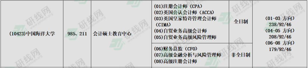 中國海洋大學(xué)2021年會計專碩復(fù)試分?jǐn)?shù)線:全日制(01-03方向)238/92/46(04-05方向)208/92/46;非全日制(06-08方向)179/92/46