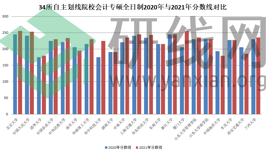 34所自主劃線院校會(huì)計(jì)專(zhuān)碩全日制2020年與2021年復(fù)試分?jǐn)?shù)線對(duì)比如下: