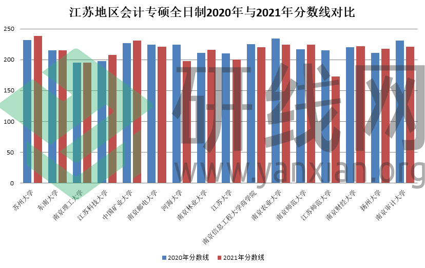 江蘇地區會計專碩全日制2020年與2021年復試分數線對比如下: