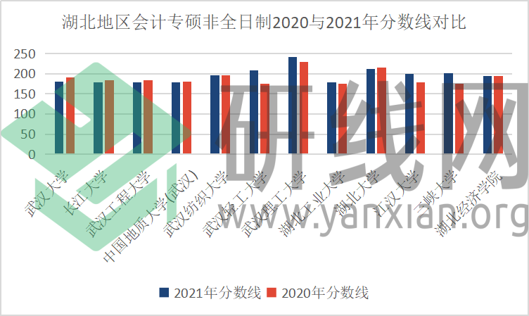 | 湖北地區會計專碩非全日制2020與2021年分數線對比 | ||