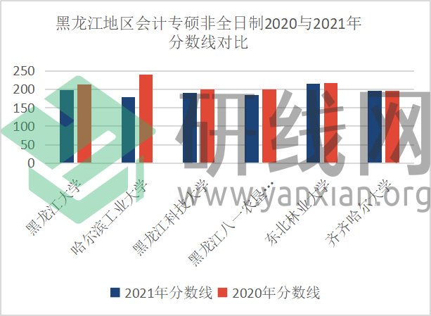 | 黑龍江地區會計專碩非全日制2020與2021年分數線對比 | ||