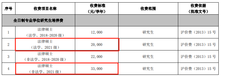 法律(非法學)全日制:學費33000元/年