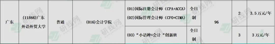 廣東外語(yǔ)外貿(mào)大學(xué)2021年全日制會(huì)計(jì)專(zhuān)碩學(xué)制學(xué)費(fèi):研究方向(01)國(guó)際注冊(cè)會(huì)計(jì)師(CPA+ACCA)、(02)國(guó)際管理會(huì)計(jì)師(CFO+CIMA)學(xué)制為2年,學(xué)費(fèi)為3.5萬(wàn)元/年;研究方向(03)“小語(yǔ)種+會(huì)計(jì)”創(chuàng)新班學(xué)制為3年,學(xué)費(fèi)為3萬(wàn)元/年