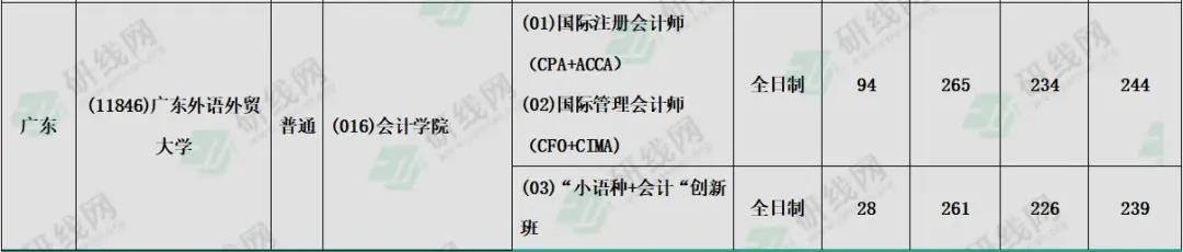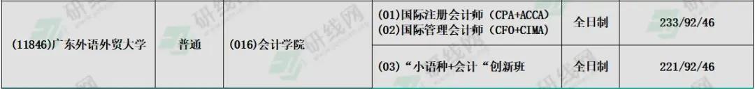 廣東外語(yǔ)外貿(mào)大學(xué)2021年全日制會(huì)計(jì)專(zhuān)碩復(fù)試分?jǐn)?shù)線:研究方向(01)國(guó)際注冊(cè)會(huì)計(jì)師(CPA+ACCA)、(02)國(guó)際管理會(huì)計(jì)師(CFO+CIMA)分?jǐn)?shù)線為233/92/46;研究方向(03)“小語(yǔ)種+會(huì)計(jì)”創(chuàng)新班分?jǐn)?shù)線為221/92/46