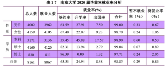 南京大學(xué)2020屆畢業(yè)生總體就業(yè)率為98.85%,暫不就業(yè)率(擬國(guó)內(nèi)升學(xué)、擬出國(guó)等)為0.29%待就業(yè)率為0.86%。其中本科畢業(yè)生就業(yè)率為98.90%,碩士畢業(yè)生就業(yè)率為99.04%,博士畢業(yè)生就業(yè)率為97.71%。(數(shù)據(jù)截止時(shí)間:2020年11月30日)