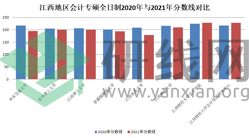 | 江西地區會計專碩全日制2020年與2021年分數線對比 | ||