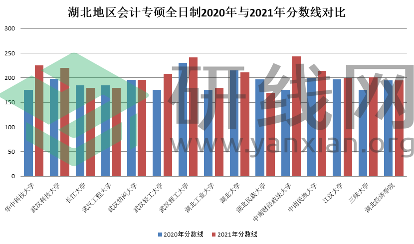 湖北地區(qū)會(huì)計(jì)專(zhuān)碩全日制2020年與2021年復(fù)試分?jǐn)?shù)線對(duì)比如下: