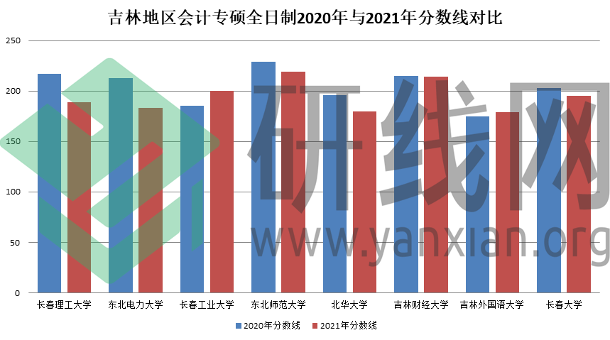 | 吉林地區會計專碩全日制2020年與2021年分數線對比 | ||