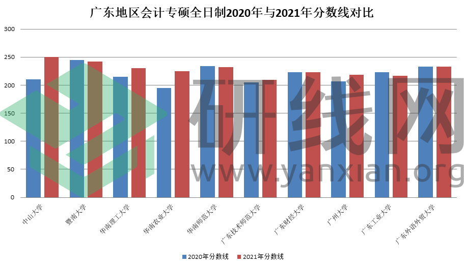 | 廣東地區會計專碩全日制2020年與2021年分數線對比 | ||