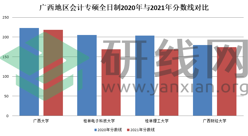 廣西地區(qū)會計專碩全日制2020年與2021年復(fù)試分?jǐn)?shù)線對比如下: