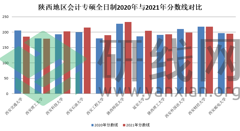 | 陜西地區會計專碩全日制2020年與2021年分數線對比 | ||