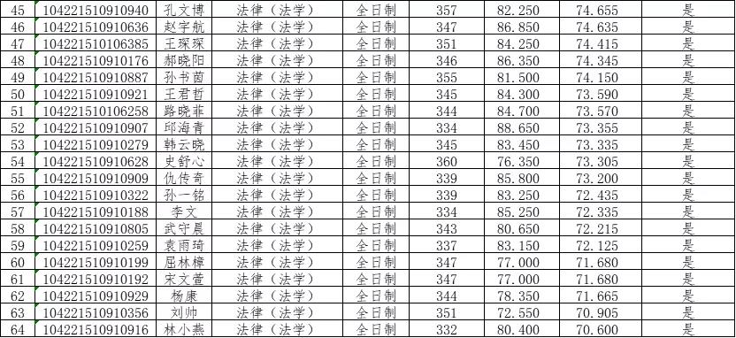 法律(非法學):全日制錄取72人,最高分414分,最低分354分;