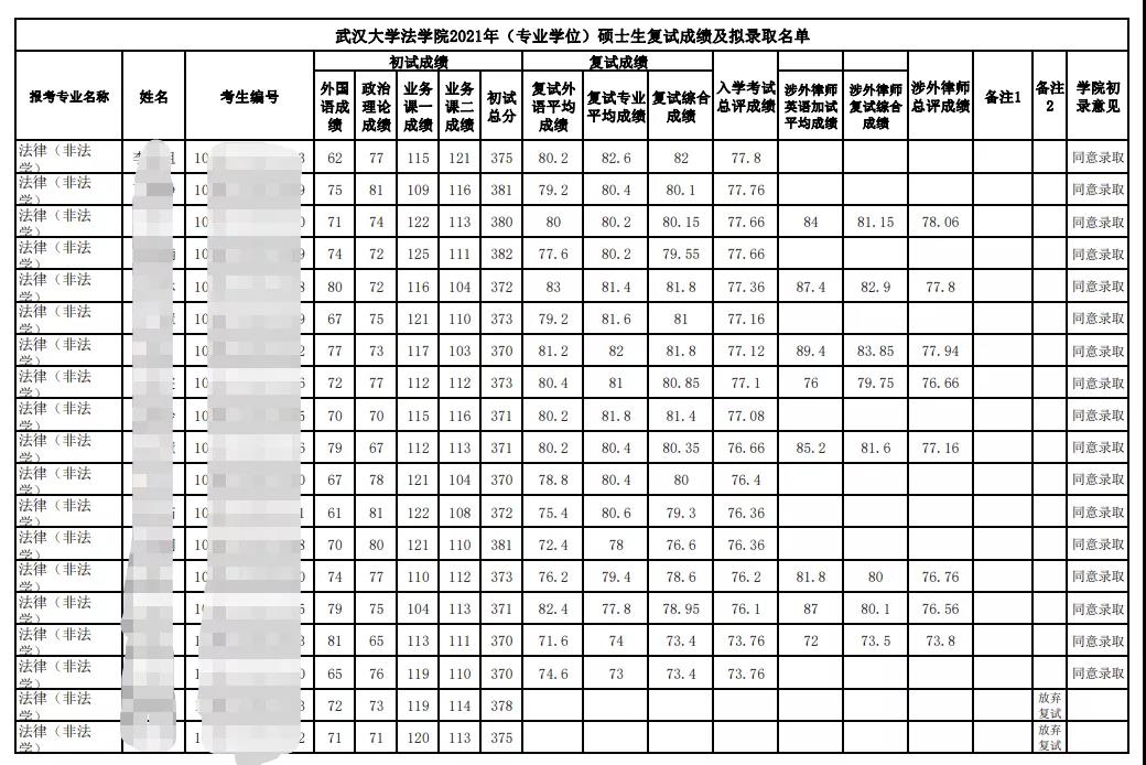 武漢大學2021年法律碩士錄取情況:
