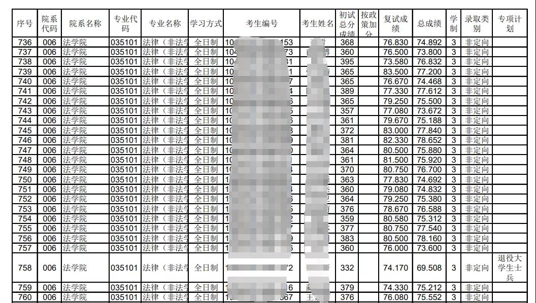 法律(非法學):全日制錄取69人,最高分397分,最低分356分;