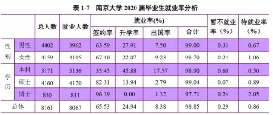 南京大學2020屆畢業生總體就業率為98.85%,暫不就業率(擬國內升學、擬出國等)為0.29%,待就業率為0.86%。其中本科畢業生就業率為98.90%,碩士畢業生就業率為99.04%,博士畢業生就業率為97.71%。( 數據截止時間: 2020年11月30日)