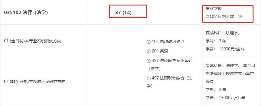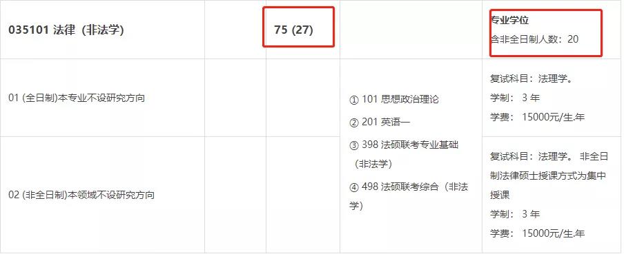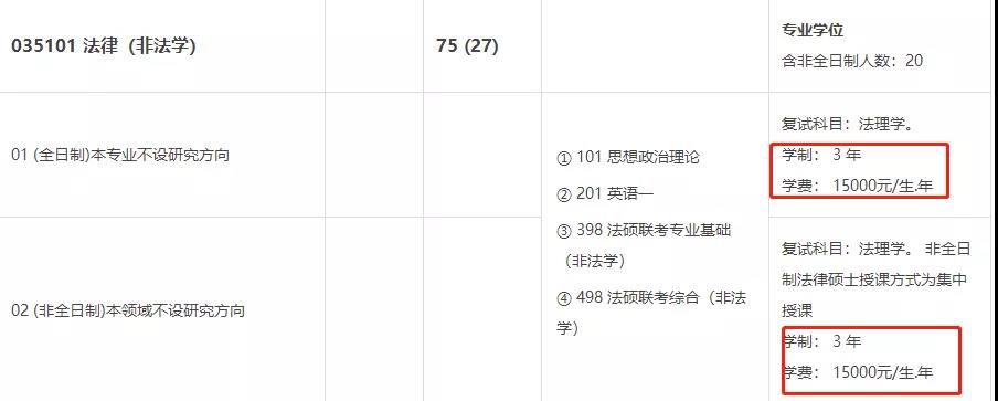 法律(非法學、法學):全日制、非全日制學制 3 年,學費15000 元/生·年。