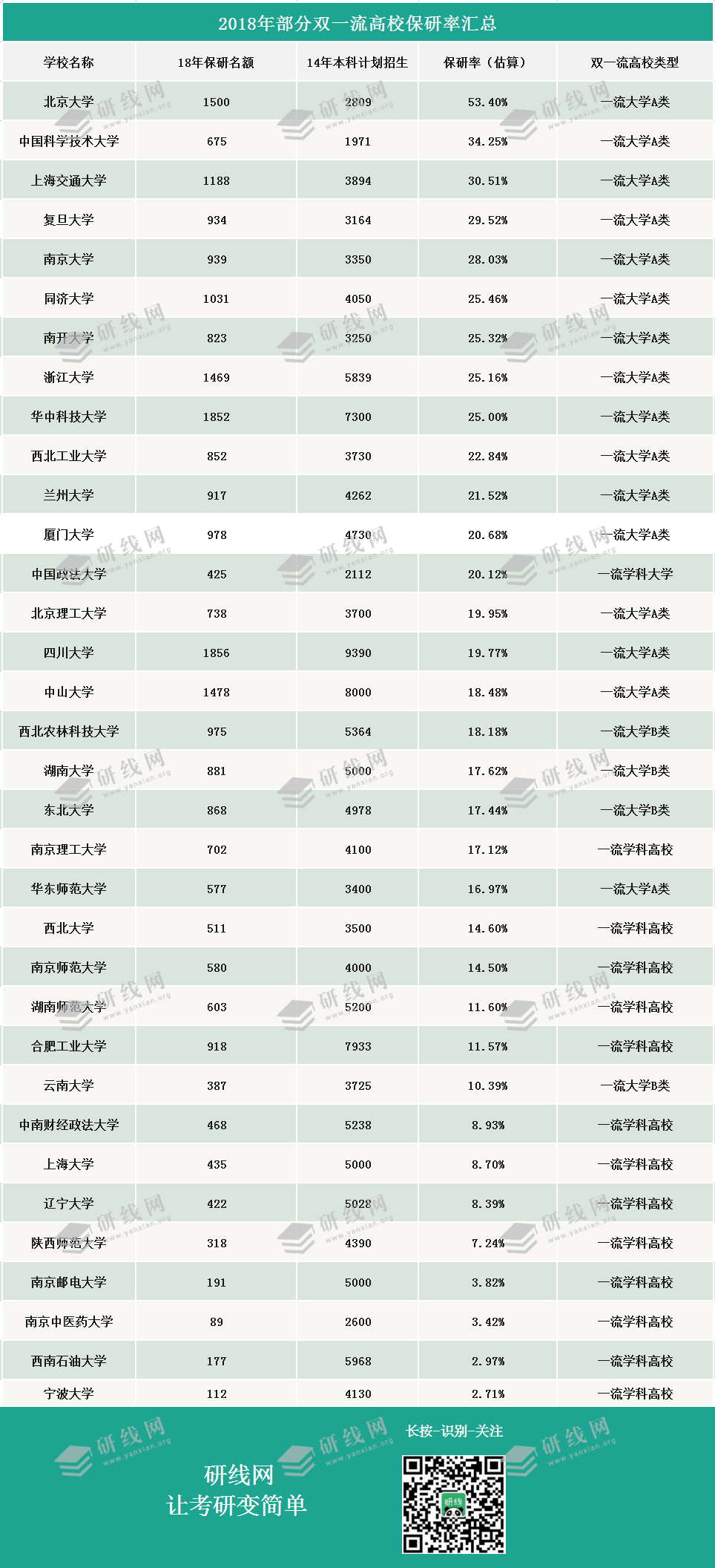 2.按照教育部的規定,設有研究生院的高校,保送研究生名額一般才按該校應屆本科畢業生數15%左右確定。大部分A類一流大學都超過了這個標準,可見其考研難度的增大。