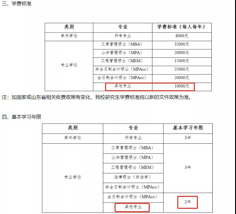 山東財經大學2021年稅務碩士學制學費:學制為2年,學費為1.0萬元/年