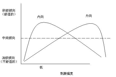 喚醒是指大腦皮層隨時準備反應的警覺狀態,它取決于中樞神經系統中上行網狀激活系統的激活水平。Eysenck認為內向者的大腦皮質喚醒水平天生比外向者高,因此,對于同樣強度的刺激,內向者比外向者體驗的強度更高,因而更敏感。極強或極弱的水平的刺激都會產生消極的情緒體驗,只有中等強度的刺激才產生積極、快樂的情緒體驗,刺激強度水平與內、外向者情緒體驗之間的關系呈倒U型,而且內向和外向者倒U形的峰點不同。如圖: