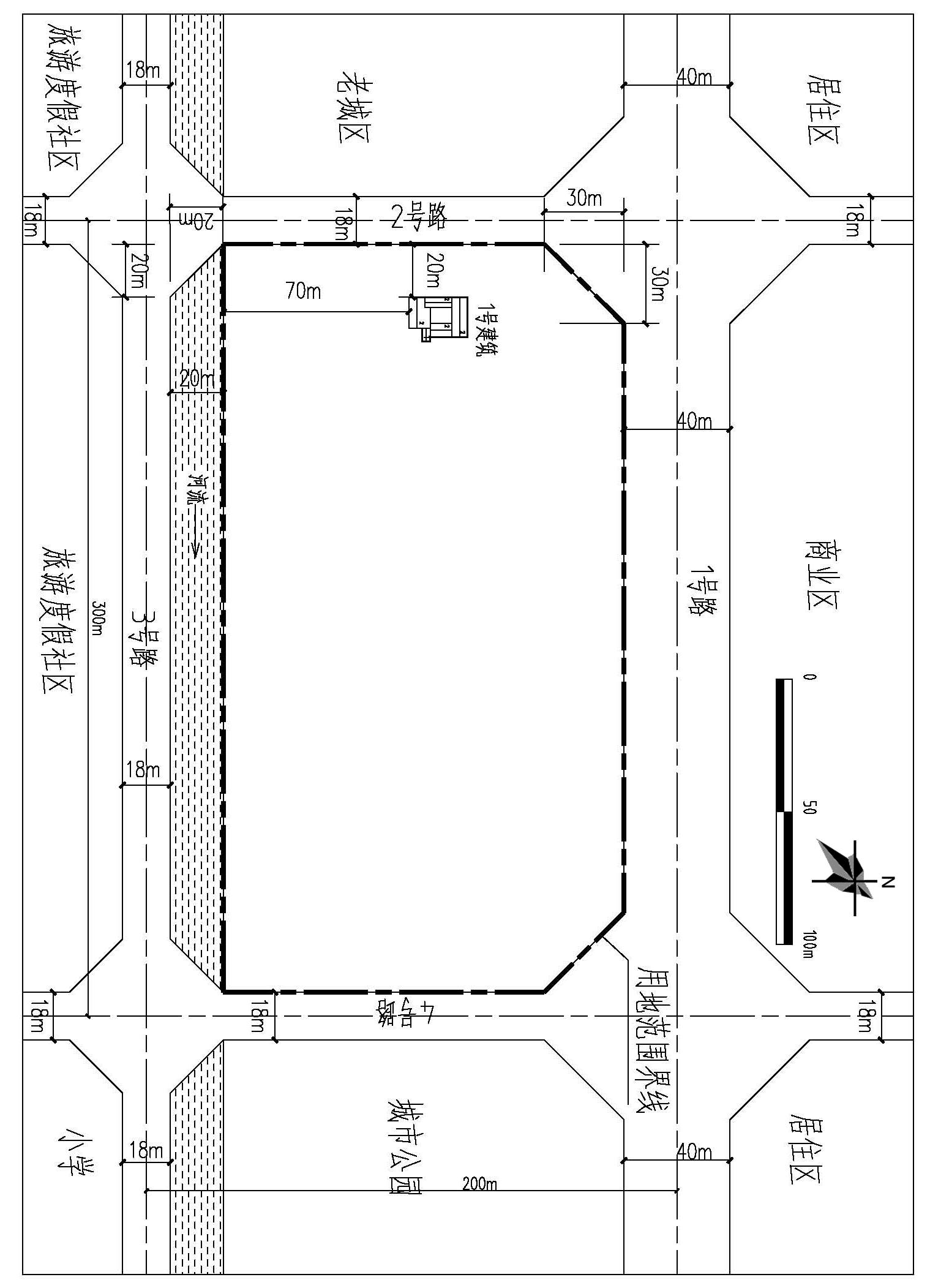 | 南方某旅游小鎮(zhèn)地段城市設(shè)計(150分) (一) 基地概述: 規(guī)劃地段位于南方某旅游小鎮(zhèn),位于城市中心區(qū)以南15分鐘步行距離,周圍交通便利(周邊用地功能如圖所示),場地內(nèi)部地勢平坦,南部有一條河流穿過,水質(zhì)良好。地段為棚戶區(qū)改造,原有房屋大多已拆除,尚存西部一棟有完整院落的傳統(tǒng)民居(1號建筑),當?shù)卣A(yù)備將其申報為歷史建筑。地塊的南邊及西南邊已建有相當規(guī)模的旅游度假社區(qū)(150戶),整體環(huán)境良好。基地北側(cè)城市道路紅線40米,基地東側(cè)、南側(cè)、西側(cè)道路紅線18米。總用地面積4.17ha。該地段在上位規(guī)劃中為商住兼容用地,商住比為4:6。 (二) 規(guī)劃設(shè)計: 1.擬結(jié)合周邊功能用地現(xiàn)狀及交通條件,對該地塊進行開發(fā)建設(shè)。具體內(nèi)容和建筑面積結(jié)合方案自定。 2. 要求: (1)對1號路、2號路、3號路、4號路進行道路橫斷面設(shè)計,并反映在總圖中。 (2)按建筑面積1車位/100m2配置相應(yīng)停車位。地下停車位數(shù)不少于總停車位數(shù)的50%。 (3)容積率≤1.6。 (4)建筑密度≤40%。 (5)綠地率≥30%。 (6)除特殊說明外建筑棟數(shù)、層數(shù)、層高自己設(shè)定。 (7)基地內(nèi)建筑限高18米。 (8)基地內(nèi)設(shè)立一個建筑面積≥100 m2的城市公廁。 (9)日照間距1:1。 (10)規(guī)劃設(shè)計需符合國家有關(guān)規(guī)范。 (三) 成果要求: (1)設(shè)計說明及主要經(jīng)濟技術(shù)指標。 (2)規(guī)劃總平面圖1:1000,應(yīng)標注建筑物及空間的功能(名稱)、層數(shù),標注車輛及人行出入口位置、風(fēng)玫瑰、比例尺以及重要間距和尺寸等內(nèi)容。 (3)功能分區(qū)、交通組織、綠地景觀等分析圖,比例不限。 (4)整體軸測圖1:1000。 (5)在A2圖紙上墨線手繪(徒手或尺規(guī))完成,上色與否自定,圖紙張數(shù)2張。 |