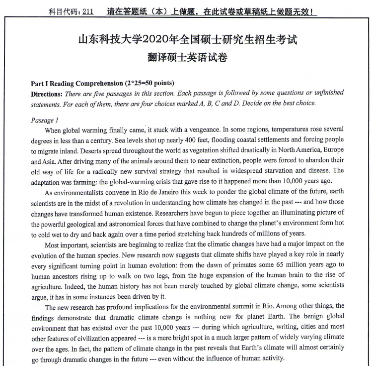 以上就是小編整理的“考研真題:山東科技大學(xué)211翻譯碩士英語(yǔ)2020年碩士研究生自命題試題”的全部?jī)?nèi)容!更多真題資料請(qǐng)關(guān)注“考研專(zhuān)業(yè)課真題”欄目!祝考研成功!