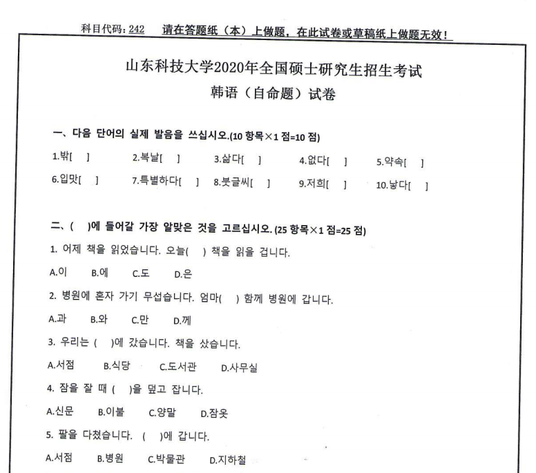 以上就是小編整理的“考研真題:山東科技大學242朝鮮語2020年碩士研究生自命題試題”的全部內容!更多真題資料請關注“考研專業課真題”欄目!??佳谐晒Γ?/div>