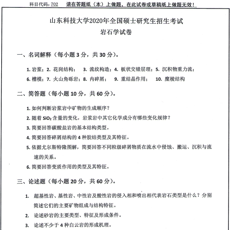 考研真題:山東科技大學702巖石學2020年碩士研究生自命題試題