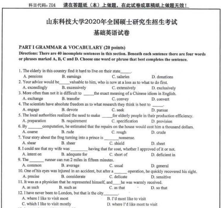 以上就是小編整理的“考研真題:山東科技大學704基礎英語2020年碩士研究生自命題試題”的全部內容!更多真題資料請關注“考研專業課真題”欄目!??佳谐晒Γ?/div>