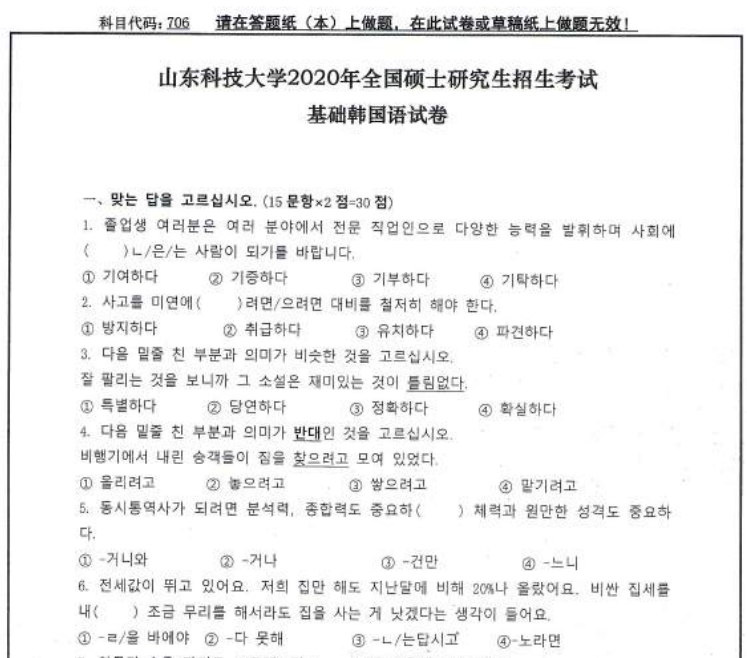 以上就是小編整理的“考研真題:山東科技大學706基礎韓國語2020年碩士研究生自命題試題”的全部內容!更多真題資料請關注“考研專業課真題”欄目!祝考研成功!