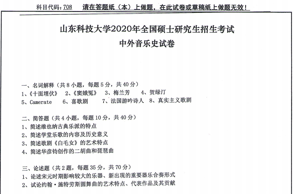 以上就是小編整理的“考研真題:山東科技大學708中外音樂史2020年碩士研究生自命題試題”的全部內容!更多真題資料請關注“考研專業課真題”欄目!祝考研成功!